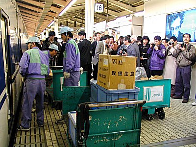 大勢の人が、東京駅最後の最後の食堂車取り下ろし作業を見守った。(112A)